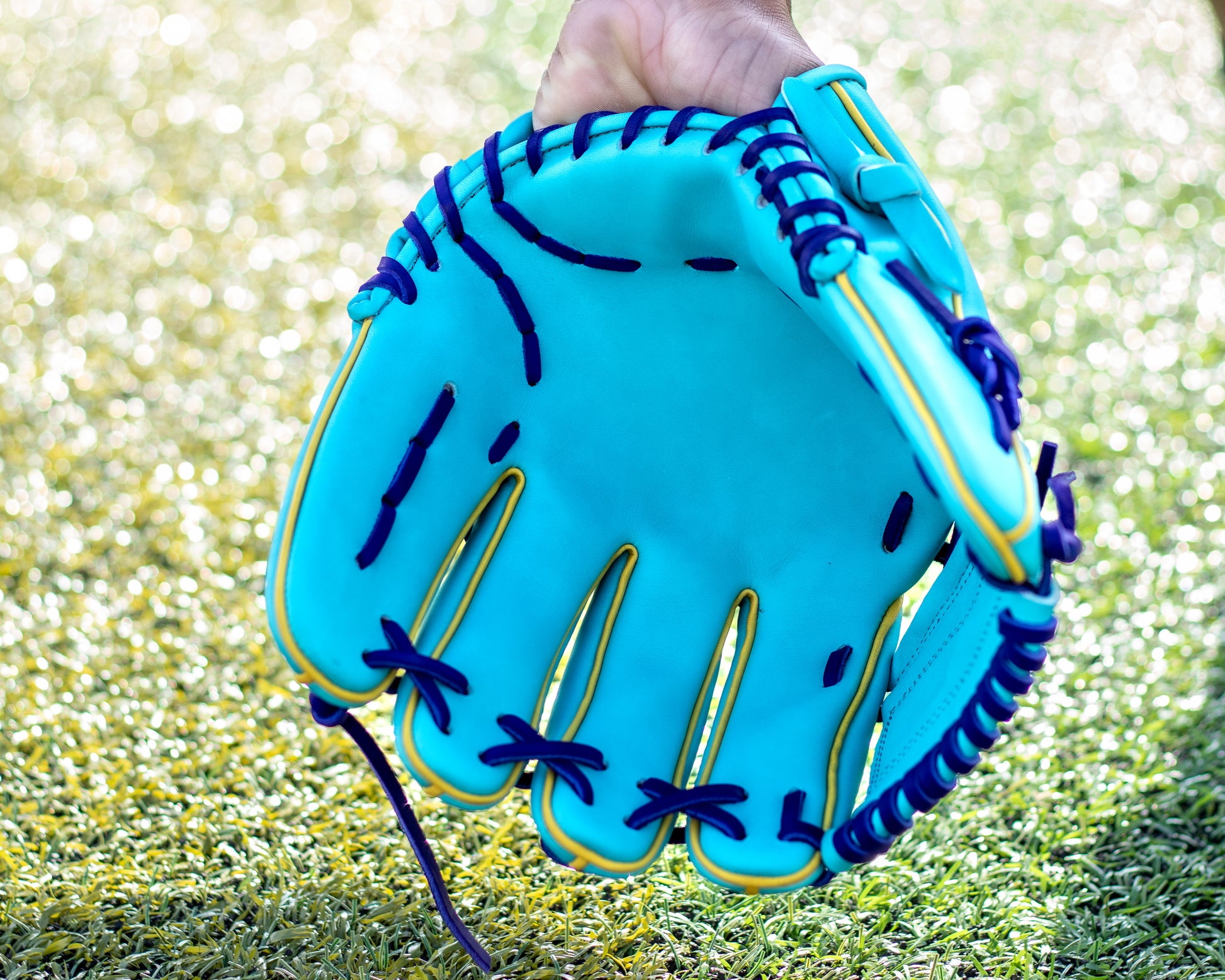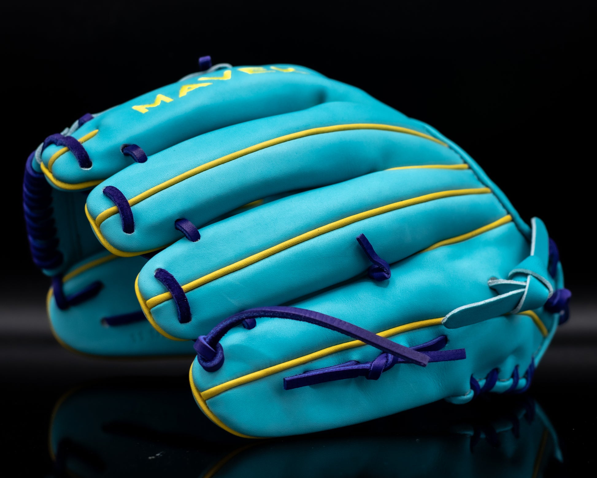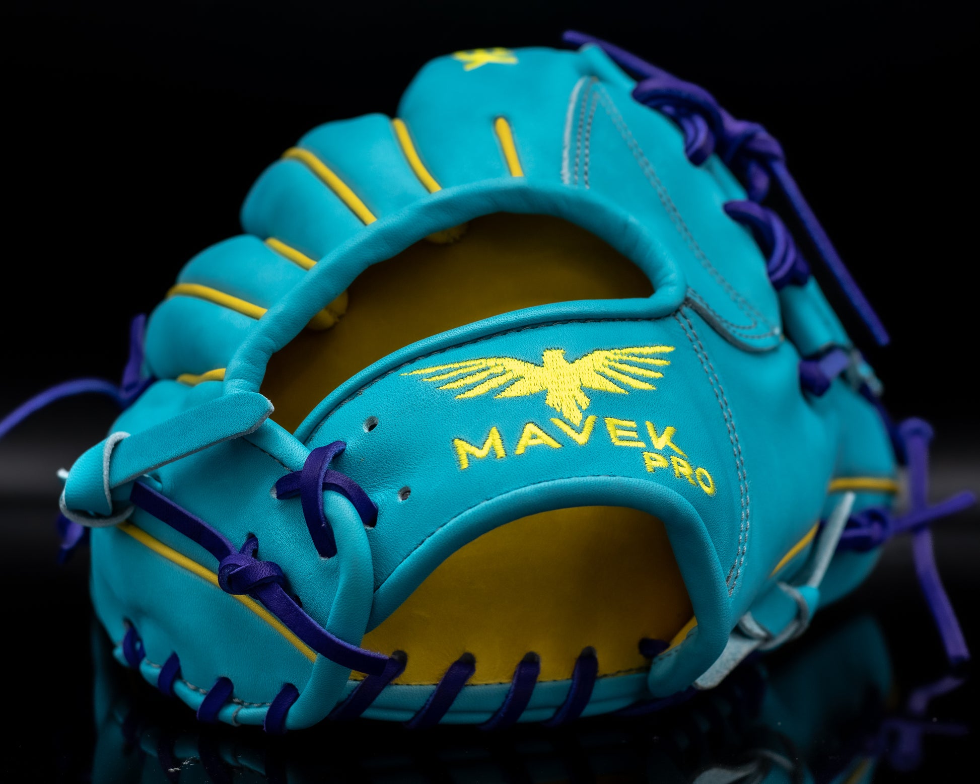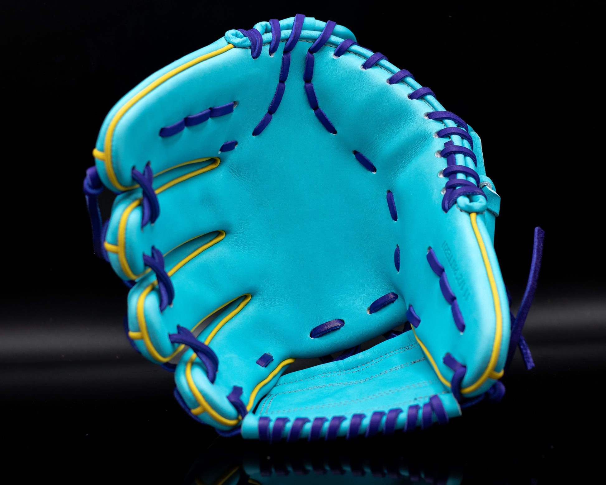 The one piece web provides a clean pocket and quick ball control, making it ideal for shortstops and second basemen who play fast and sharp. Finished in a bold aqua shell with purple laces, yellow accents and steel grey stitching, this glove turns heads while it turns double plays.